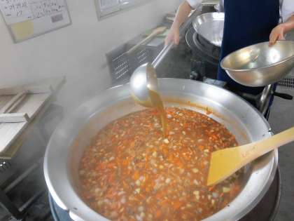 ・ビーフシチュー ・きゅうりのサラダ ・あまなつかん ・黒糖パン ・牛乳 です。「ビーフシチュー」には、綿実油と小麦粉をしっかりいためた手作りルウを使っています。