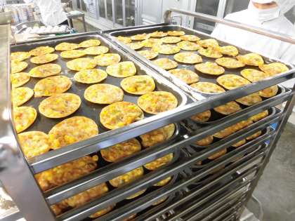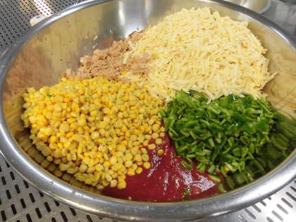 ぎょうざの皮に、ツナ、コーン、ピーマン、ピザソース、チーズを混ぜ合わせた具をのせ、焼き物機で焼いています。