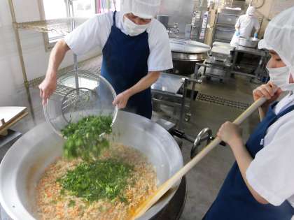 ・焼き物機で蒸した白玉だんごを、くっつかないように甘さ控えめのたれでからめています。お皿できな粉をかけて食べてくださいね。