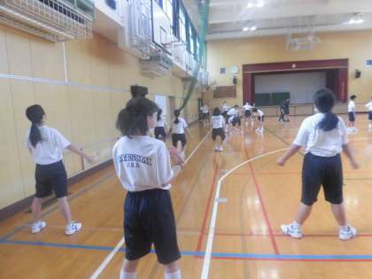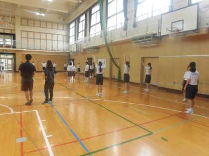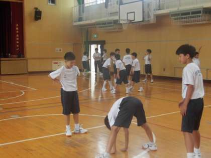 グループに分かれて、ラジオ体操をお互いに見せ合いながら、練習をしています。