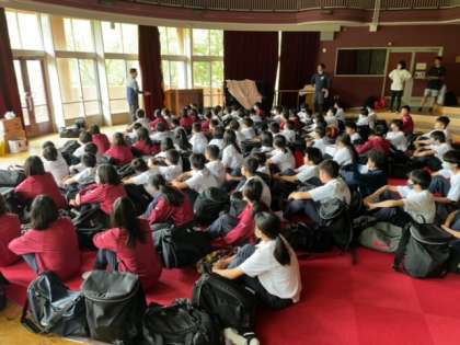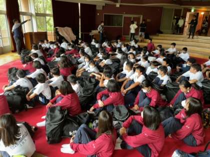小雨のため、オリエンテーションホールで集合です。