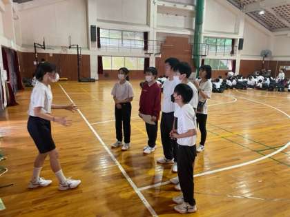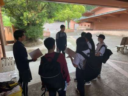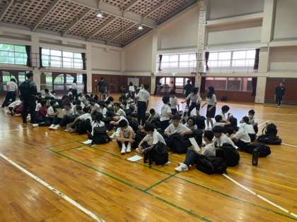 オリエンテーリング途中で実施する予定のクイズを体育館に移動して解いています!