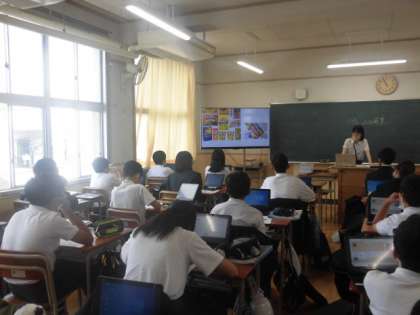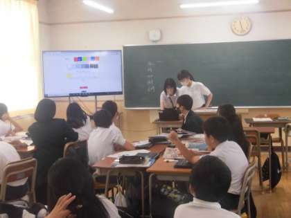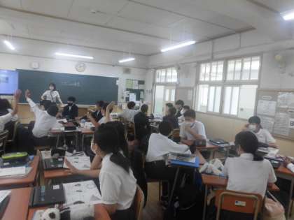 今日は美術科の研究授業で、教育センターから指導に来ていただいています。日常にひそむ色について、色の三要素や三原色、色相環について、学習をしました。