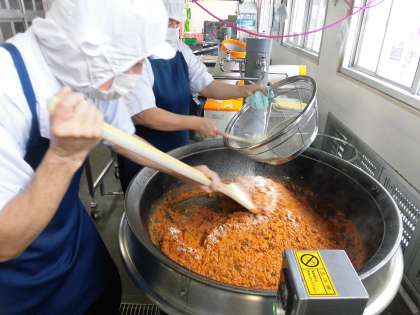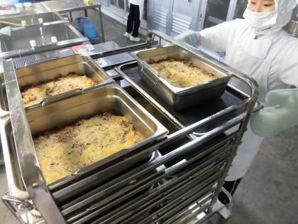 炒めた具材を、クラスごとにミニバットに入れて、パン粉をふって、焼き物機で焼いています。旬のかぼちゃの甘みとひき肉の旨みがとてもよく合う、ケチャップ味のグラタンです。今日は、粉末チーズを使っていないので、乳アレルギーのある人も、食べることができます。