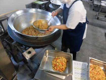 鶏肉、いか、赤ピーマンなどの野菜をオリーブ油でいため後、米と調味料を加えて、ミニバットに入れて蒸し焼きにしています。