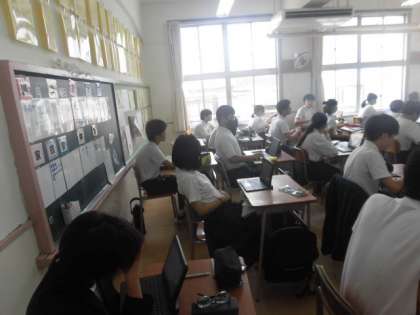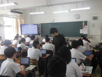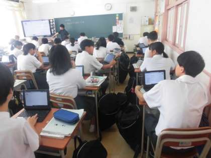 理科の夏休みの宿題は、「日常生活の中の疑問や不思議」についてタブレットでまとめます。まとめ方についての説明を聞いています。