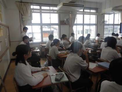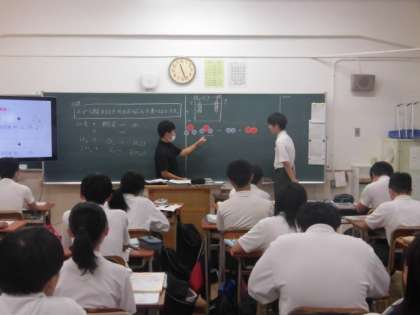 今日は研究授業で教育センターの先生にも見ていただいています。水の分解についての化学式をみんなで一緒に考えることができました。