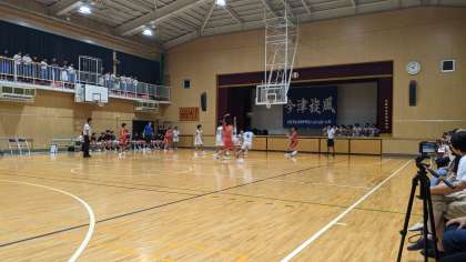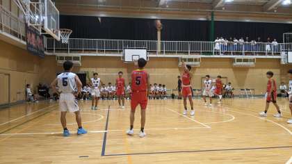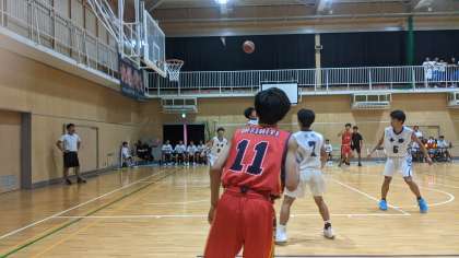 今津中学校で今津中学校と男子バスケットボール部の試合が行われました。前半を25対25で折り返しました。3クォーター終了時点では40対44とリードされていましたが、終了間際のスリーポイントシュートで追いつき、延長戦に突入しました。最後も良い場面でシュートが決まり、64対62で勝利しました!手に汗握る熱戦でした