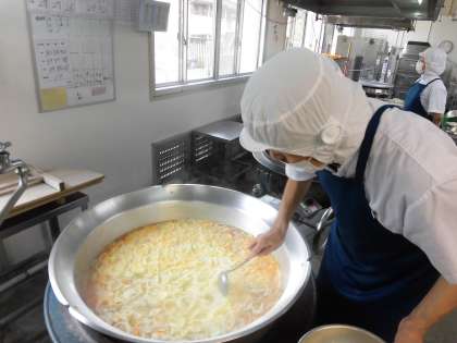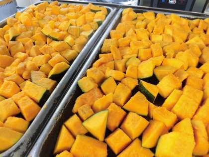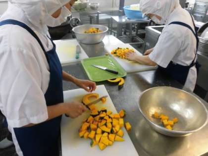 生のかぼちゃを給食室で切って、塩をふって焼き物機で焼いています。