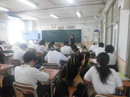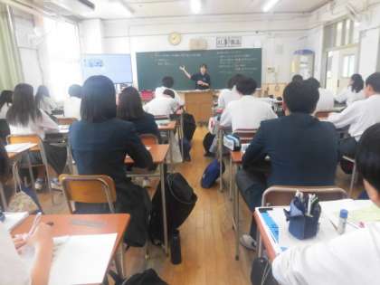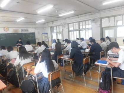 物質のもつ今の運動状態を続けようとする「慣性」について学習をしています。実際にバスに乗っている時に、急に発車したり、止まったりした時にどうなるかを考えています。