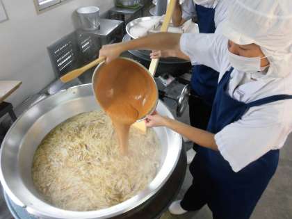 「酢豚」は、下味をつけてでんぷんをまぶして油で揚げた豚肉を、野菜などをいためて作った甘酢あんに入れてからめています。
