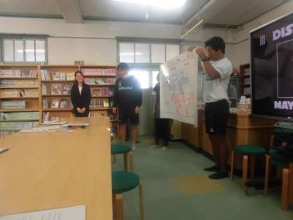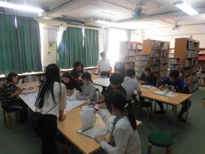 それぞれ見学したグループで、話し合いをしています。教育センターからは、中西アドバイザーと讃井総括指導主事のお二人に来ていただき、ご助言をいただきました。いつものように非常に和やかな雰囲気で、とても良い交流ができました。