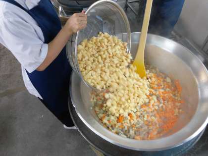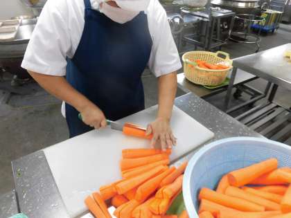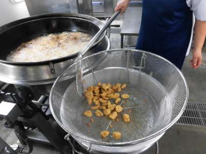 油で揚げた一口カツに、八丁みそ、赤みそ、砂糖、みりんで作ったたれをからめています。たれがよくからむように、水どきでんぷんでとろみをつけています。
