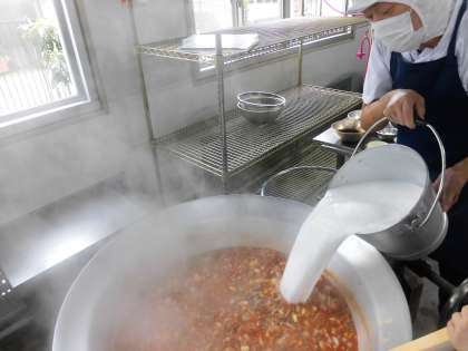 給食でいつも出ているハヤシライスは、小麦粉で作るブラウンルウを使ってとろみをつけていますが、今日のハヤシライスは米粉(上新粉)を使ってとろみをつけています。