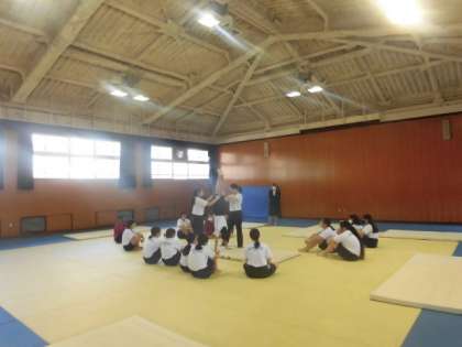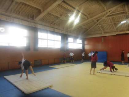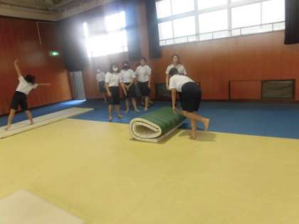 格技室でマット運動をしています、倒立前転や側方倒立回転の練習をしています。しっかりと補助をして協力しながら、練習に取り組んでいます。