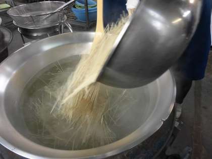 豚骨スープを使って、チンゲンサイ、もやし、にんじんが入った汁めんに、肉みそをのせて食べます。