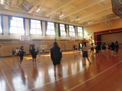 男子は運動場でハンドボールの試合をしています。女子は体育館で、バレーボールのルールを確認しています。