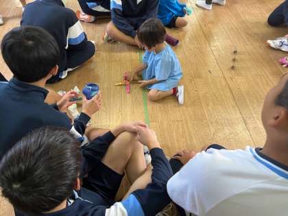 生徒自身が作ったおもちゃを使って、園児と一緒に遊んでいます。