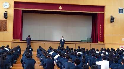 今週水曜日から11月になりますので、防寒着、防寒具についてのお話がありました。昨年と変更になっていることもありますので、特に2、3年生のみなさんは間違えないように生徒手帳などで確認しましょう。
