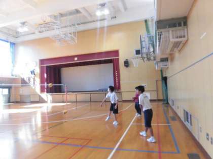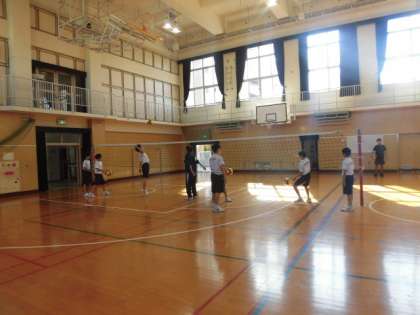 体育館でバレーボールをしています。練習を重ねるにつれ、スパイクやサーブが力強くなってきました!