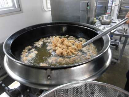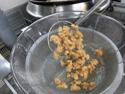 衣をつけて油で揚げた鶏肉に、白ねぎが入ったたれをからませています。ごま油がきいた、おいしいたれです。