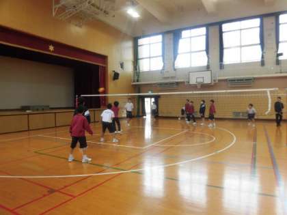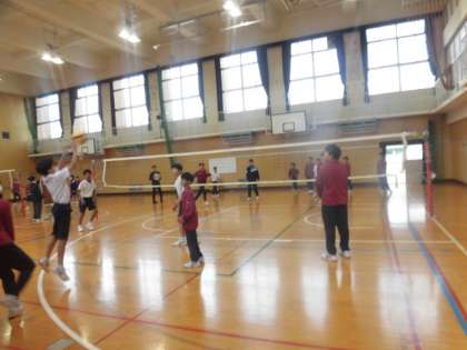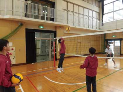 バレーボールでスパイクのテストをしたり、ゲームを行っったりしています。見事、三段攻撃が成功した場面もありました!