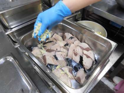 なまりぶしをミニバットに入れて、しょうがと調味液を入れて、焼き物機で煮ています。