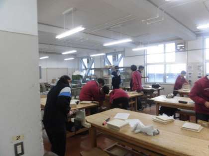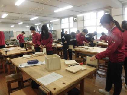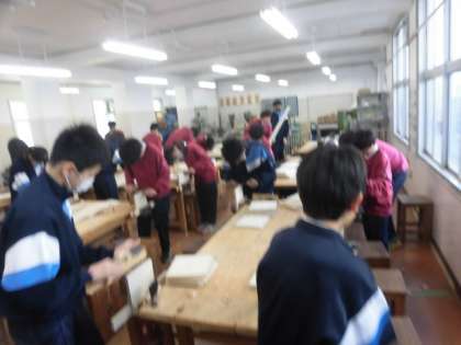 今日は「ノコギリ」を使っています。板を切って、箱を作る予定です。みんな一心不乱に板を切っています。