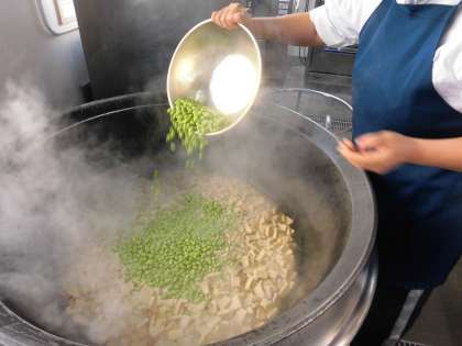 「高野どうふの煮もの」は、高野どうふとむきえだまめを使っています。だしがしっかりと浸みて、おいしいですよ。