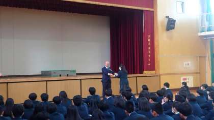 書道部の数名が表彰され、代表者1名が校長先生より賞状を受け取りました。