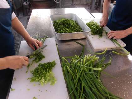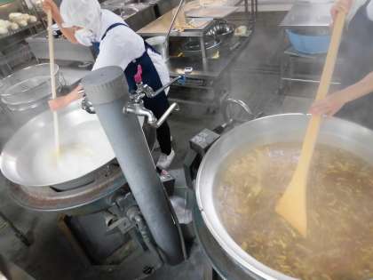 うどんは、小麦粉、塩、水を合わせて練った生地を細長いめんにして、ゆでて食べます。今日は、カレー味のだしを作っている隣の釜でうどんをゆでて、だしに加えています。斜め切りの青ねぎが、彩りを加えています。
