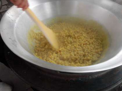 煮くずれるまでやわらかく煮たさつまいもに、くりを入れて、甘く煮含めています。