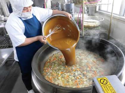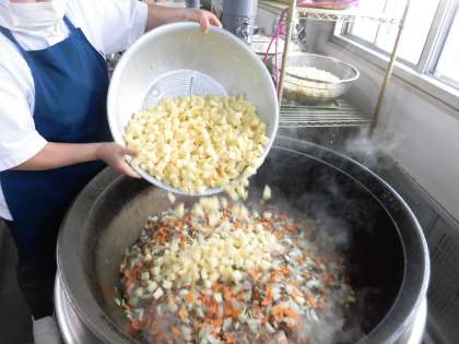 カレーライスには、調理員さんからのラッキーにんじんのプレゼントが入っています。どんな形があるか、探してみてね。
