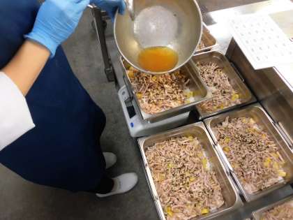 もち米と焼き豚、くり、しいたけ、調味液をミニバットに入れて、焼き物機で蒸し焼きにしています。モチモチとして、旨みもあり、とても人気がある献立です。