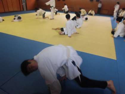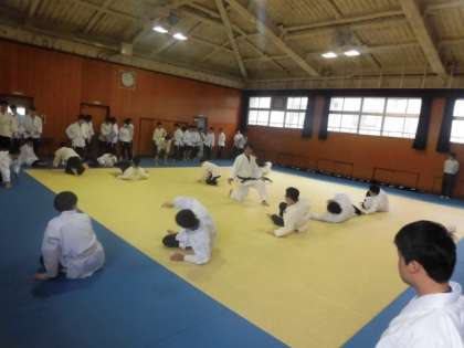 男子は格技室で柔道をしています。今日は前回り受け身をしています。
