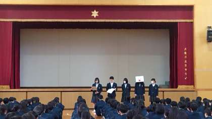 生徒会からは、朝の登校時に出題しているクイズの答え発表と明日から始まる試験に向けてのメッセージがありました。