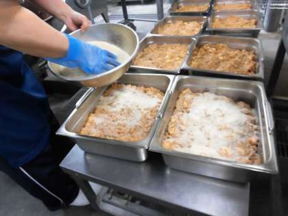 とうふと牛ひき肉、粒状の大豆と野菜を使っています。釜で作った具をミニバットに入れて、表面にパン粉をふり、焼き物機で焼いています。