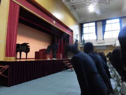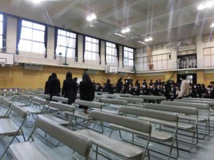 本日の1,2時間目に明日の卒業式予行を行いました。1,2年生の代表生徒もしっかりと式典の厳かな雰囲気に合わせてくれていました。明日はみんなで良い卒業式にしたいですね!