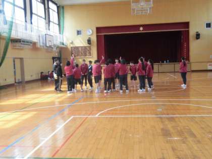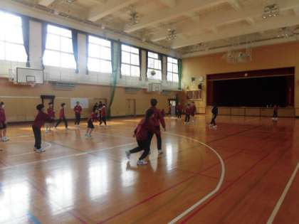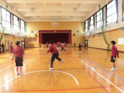 今日は体育館でドッジボールをしています。ソフトバレーのボールなので、おもいっきり投げています。