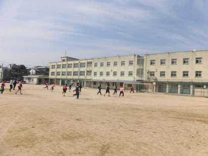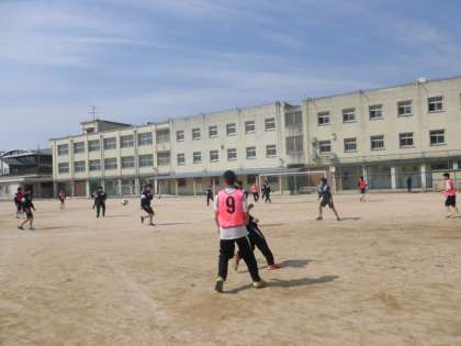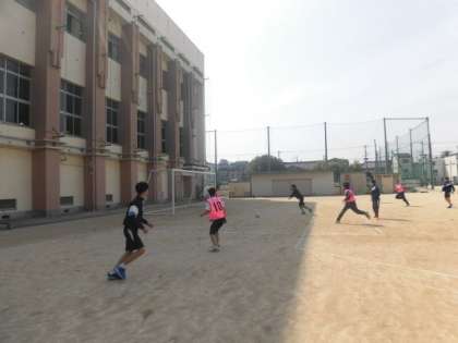 男子は運動場でサッカーの試合をしています。先生も一緒に入っています。