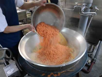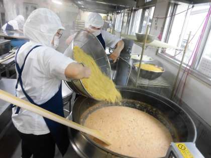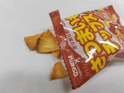 今日は、「おさつチップス」です。初めて給食に登場します。国産のさつまいもをうすく切り、油で揚げて、砂糖で甘く味つけしています。よくかんで味わって食べましょう。
