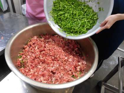 「豚肉のガーリック焼き」は、豚肉とピーマンに下味をつけて、焼き物機で焼いています。