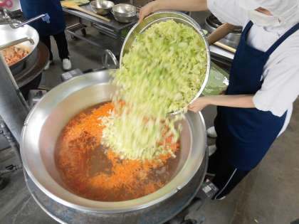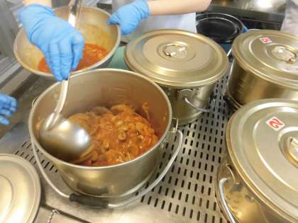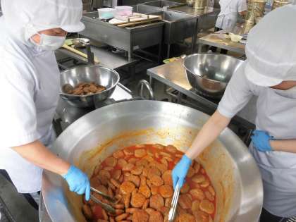 今日は、いためたたまねぎ、マッシュルーム、ケチャップなどで作ったソースでじっくりと煮こみんだ「煮こみハンバーグ」です。