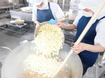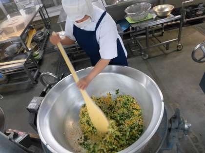 給食では、赤みそやしょうゆなどで味つけし、トウバンジャンで辛みをつけています。