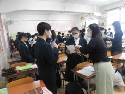 二人組や三人組になり、お互いに単語を発音しながら、確認をしています。