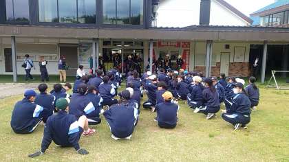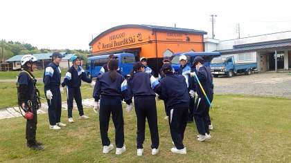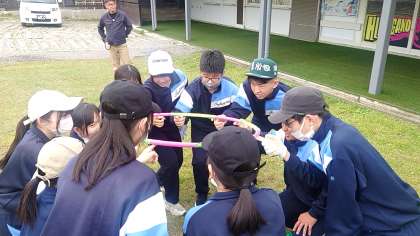 インストラクターの方々の紹介とあと、一つのフラフープを使ったチームワーク力を高めるアクティビティをしています。