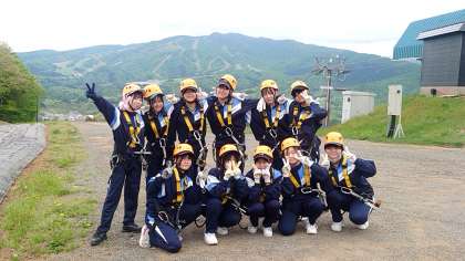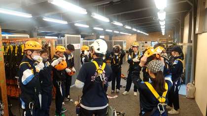 ジップライン体験の班は、装具を身に着け山頂へ来ました。