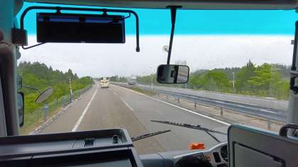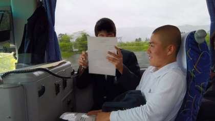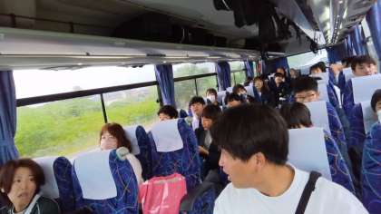 昼ご飯を食べた後は金沢市まで長い道のりになります。昼寝をしたり、音楽を聞いたり、レクを楽しんでいます。