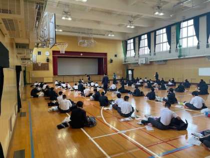 体育館で出発式後、9時頃に移動し、9時20分頃にバスが出発予定です。