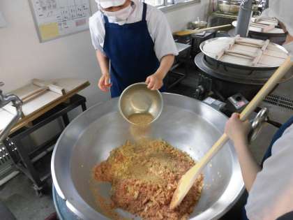 たけのこをゆでてから、かつおぶしといりごまと一緒にいためています。香ばしい香りがとてもよく、ごはんがすすむ献立です。
